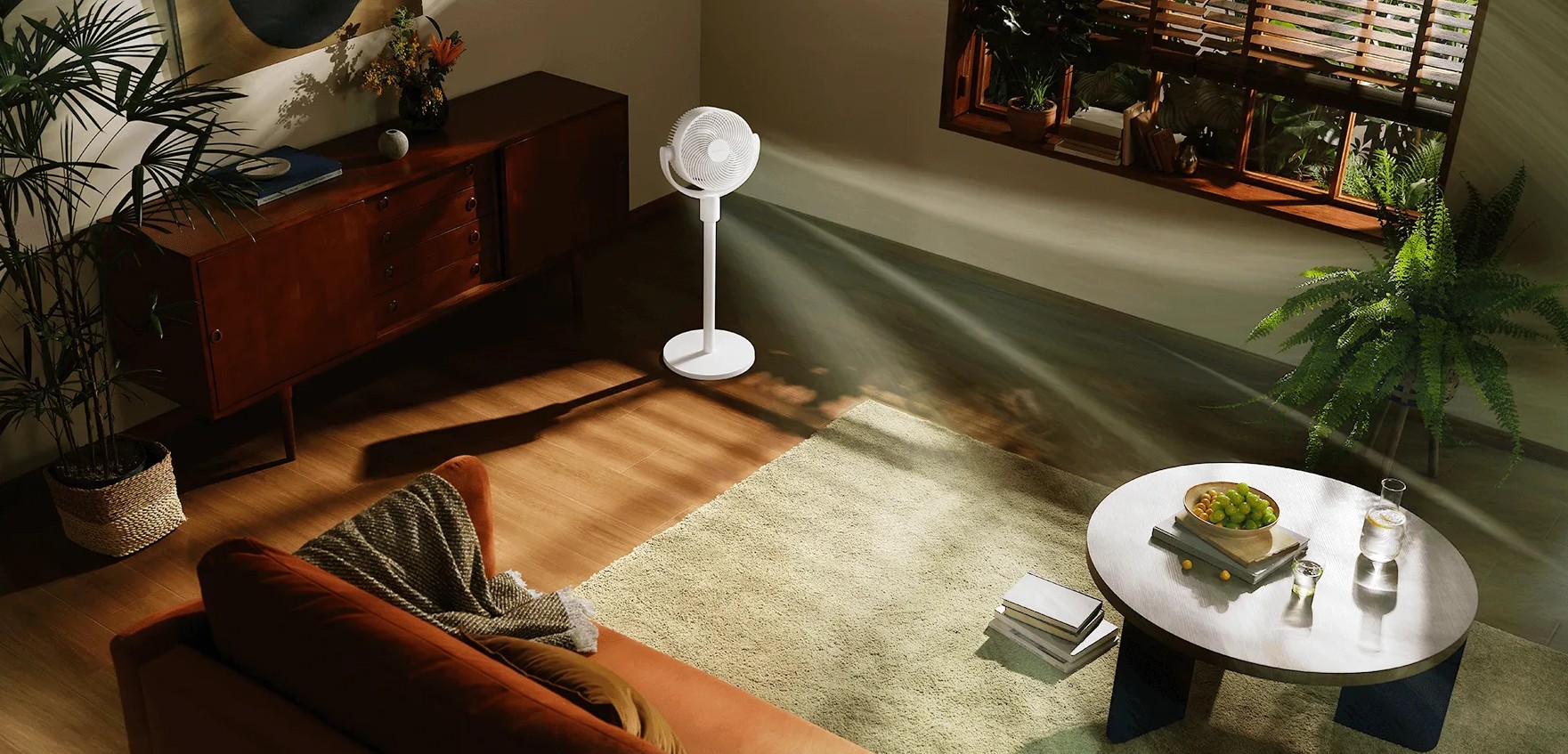 Xiaomi Smart Standing Air Circulation Fan можно использовать как напольный и настольный вентилятор. Благодаря продуманной конструкции он легко адаптируется под разные сценарии — от рабочего стола до полноценного охлаждения комнаты.