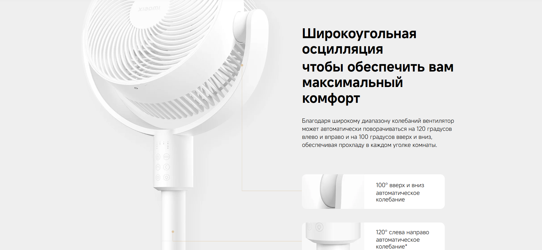 Осевой механизм создает мощный и направленный поток воздуха с дальностью до 13 метров, обеспечивая равномерное распределение прохлады по всему помещению. Вентилятор поддерживает наклон до 100° и поворот до 120°, что позволяет точно направить поток воздуха и добиться максимального комфорта.